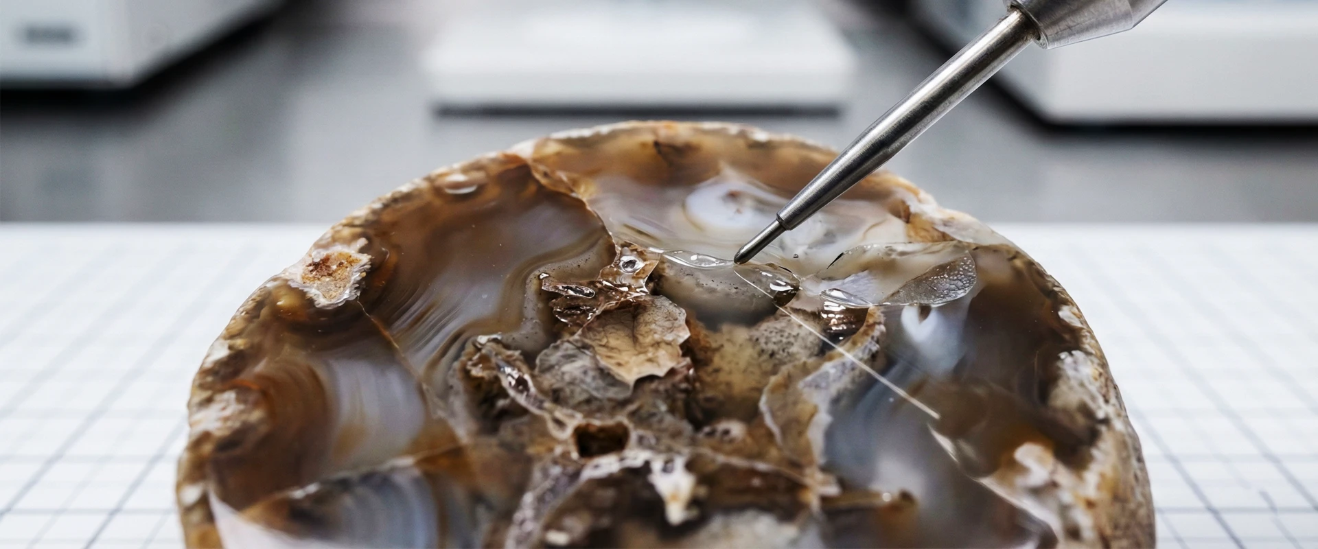 The process begins with vacuum treatment similar to dye impregnation, evacuating air from the stone’s internal fractures. Instead of colored dye solutions, however, operators introduce liquid epoxy resins or polyester compounds with optical constants matched to quartz. According to the International Gem Society, epoxies can be formulated with RIs ranging from 1.48 to 1.58 by varying the monomer composition and polymerization additives . For agate treatment, formulators target RI values of 1.53-1.54, creating minimal optical discontinuity at the resin-quartz interface.